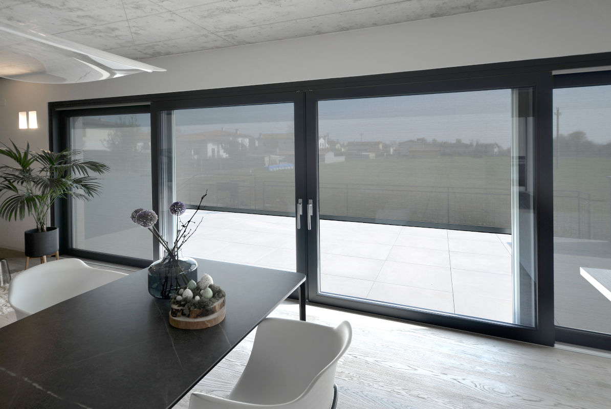 Il terminale inferiore, sempre in alluminio, avrà una forma quadra, con al suo interno apposita camera per l’alloggiamento della zavorra, necessaria per dare tensione e stabilità al tessuto. Il sistema di movimentazione a motore a 230V 50Hz IP44 avrà inoltre possibilità di azionamento singolo, a gruppi o centralizzato. Tutte le parti in alluminio saranno verniciate secondo tabella RAL. Tessuto ignifugo omologato classe C1 – M1 – B1.